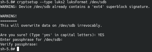 먼저 저장장치를 LUKS로 사용하기 위해서 포맷을 해야합니다. 포맷은 아래의 명령으로 가능합니다.