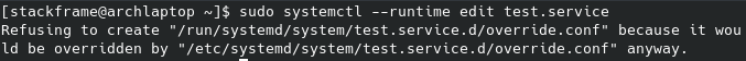추가적으로 edit 명령에 --runtime 옵션을 사용할 수 있습니다. 이 옵션과 함께 수정된 설정은 시스템이 켜져있을 때만 적용되고 리부팅하면 원상태로 돌아가게 됩니다. 대신 이미 --runtime 옵션없이 drop-in이 생성되었다면 /run 디렉토리보다 /etc 디렉토리가 우선순위가 높기 때문에 거부합니다.
