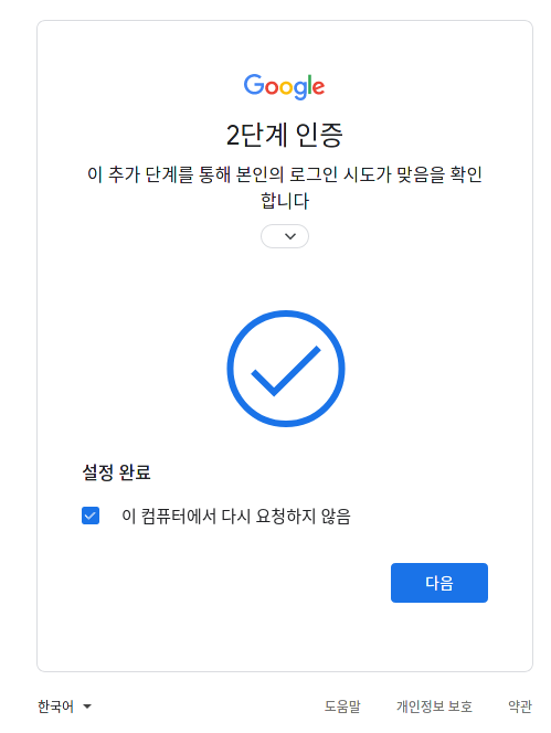 사용자가 인증키를 연결하고 버튼을 누르는 등 인증을 실행했다면 인증 프로세스가 진행되고 결과가 나오게 될 것 입니다. 아래는 구글에서 인증키로 인증이 완료되었을 때 나오는 화면입니다.