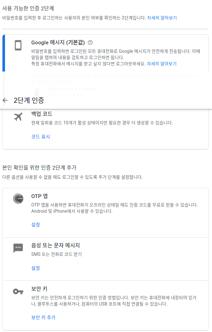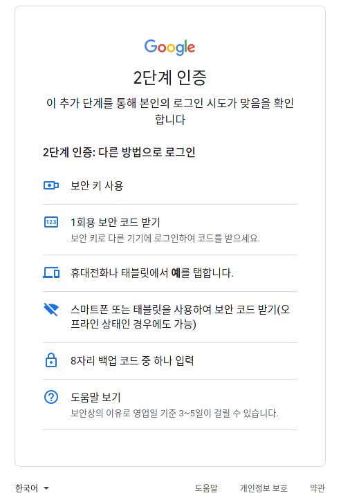 하지만 로그인을 하기위해서는 무조건 보안키가 있어야 하는 것은 아닙니다. 보안키가 기본으로 사용되긴 하지만 계정이 등록된 자신의 스마트폰을 사용하거나 백업 코드 등을 사용하면 보안키가 없어도 로그인이 가능합니다.