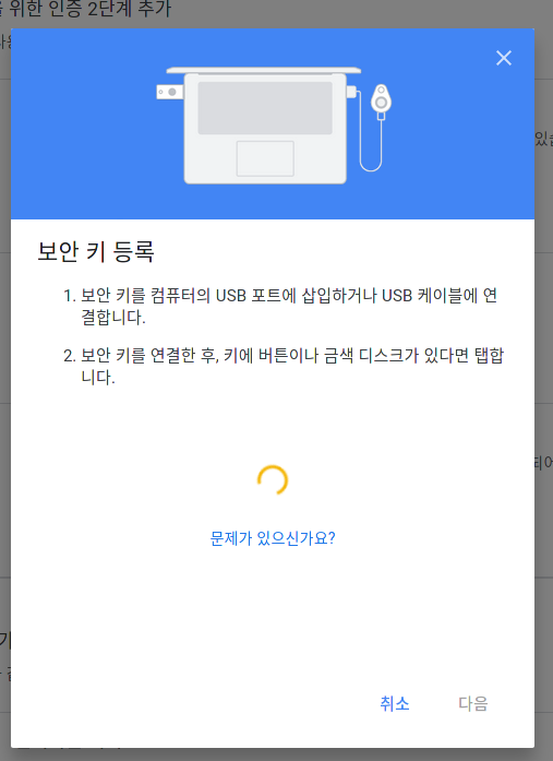 보안 키는 스마트폰도 가능하지만 보통 USB나 NFC 등을 통해 사용자를 인증하는 하드웨어를 의미합니다. 그리고 다양한 제조사에서 보안키를 만들어도 동일한 방법으로 사용가능하도록 하는 프로토콜이 FIDO입니다. 구글은 FIDO를 지원하여 이를 구현한 인증키를 통해 2차 인증을 할 수 있습니다. 저 목록 중에서 보안 키 추가를 누르고 진행하면 아래와 같은 창이 뜹니다.